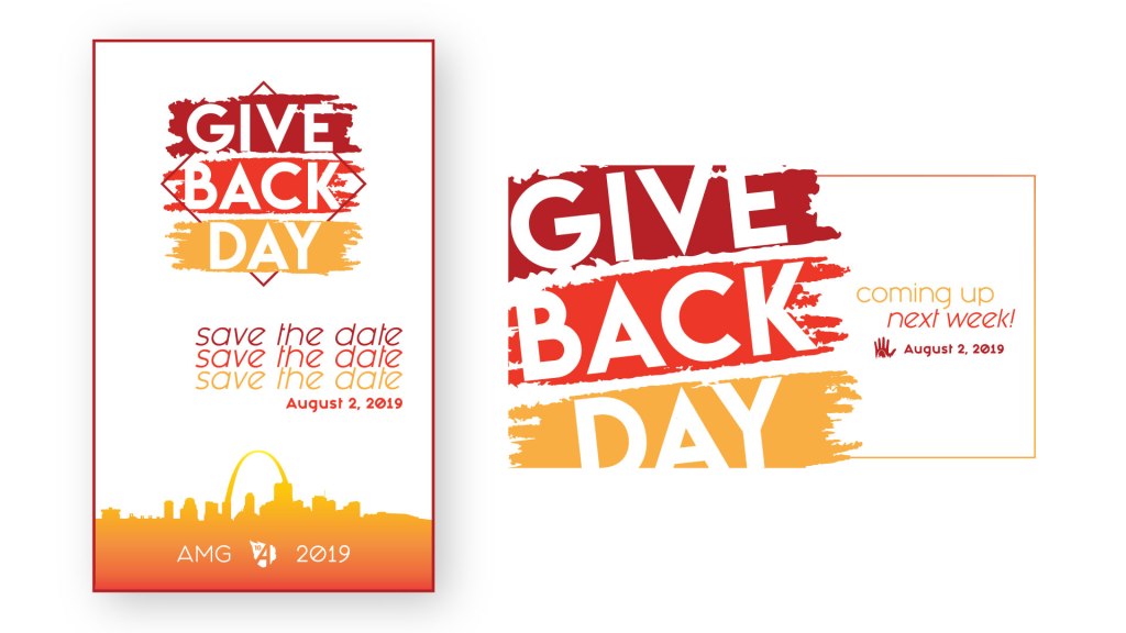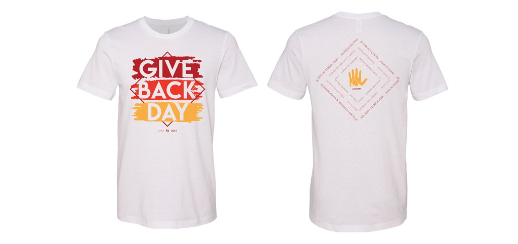 Each year I design a new t-shirt to use with Abstark’s branding and the hand logo I made the first year. The t-shirt determines the look and feel for that years Give Back Day. I used paint strokes to make the words “Give Back Day” stand out because many of the organizations were having Abstrakt’s team members paint. The triangle in the background comes from the basic shape of the Fleur de Lis that is on the St. Louis flag. I brought in the triangle on the back to feature all of the organizations names.
