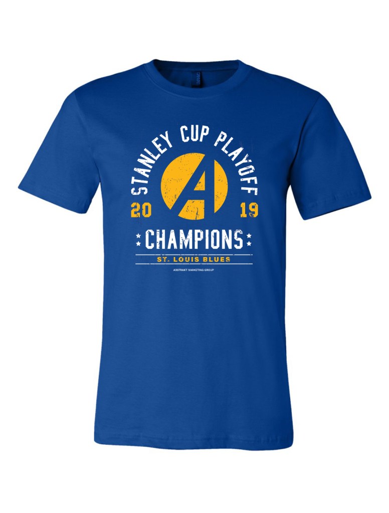 When the St. Louis Blues were in the final games of the Stanley Cup, I knew we could capitalize on t-shirts WHEN the Blues won. I made several designs, and we picked one to send out to the team pending the big win. I choose to stay with the Blues team colors instead of Abstrakt’s brand but adding in the Abstrakt logo. I choose sporty typefaces to compliment the Blues brand. The Blues made history and WON! My design was sent to the team, and here are the results.